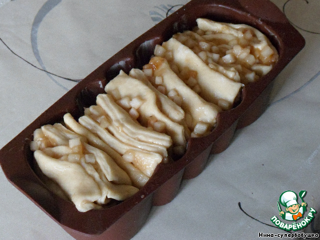 Затем выложить эти стопочки на ребро в форму для кекса. Левой рукой надо придерживать уже уложенные стопочки, чтобы они не сползали, а правой добавлять новые. У последней стопочки крайний квадрат повернуть начинкой внутрь.