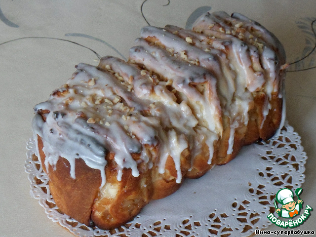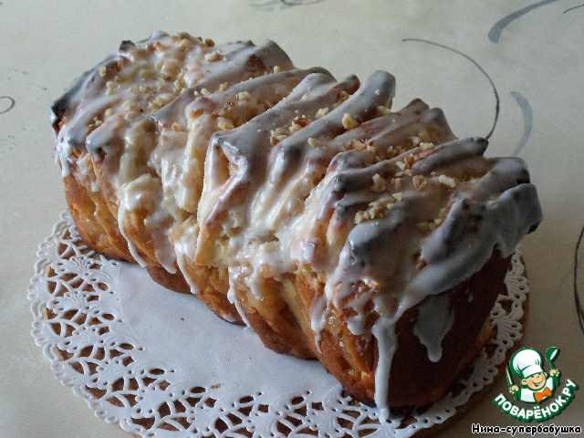 Глазурь: 1 ст.л. сливочного масла, 1 ч.л. ванильного сахара, 1/4 стакана сахарной пудры, 3 ч.л. молока. Хорошо вымешать и кисточкой покрыть пирог сверху. Можно использовать готовую глазурь со вкусом лимона фирмы «Dr. Oetker». Одного пакетика как раз хватает, а глазурь у них вкусная. Поверх глазури, пока она не застыла, можно посыпать измельченными орешками.