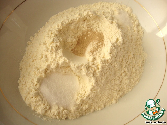 Смешать муку, соль, сахар (2 ст. л.) и дрожжи.