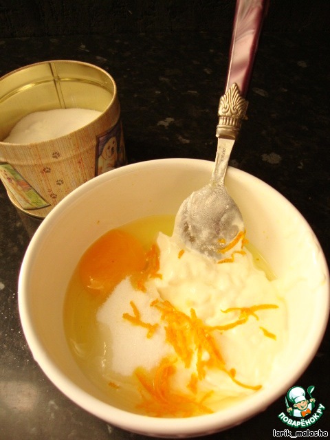 Перемешать сметану, сахар (я указала кол-во, которое использовала Я, вы регулируйте по вашему вкусу), яйцо и цедру (по желанию).