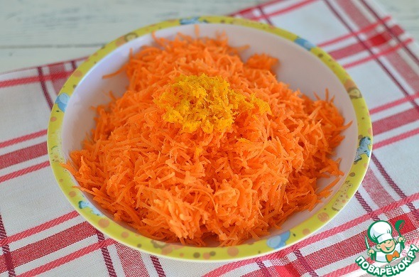 Взбить яйца с сахаром в крепкую пену. Натереть на мелкой терке морковь и цедру с апельсина.