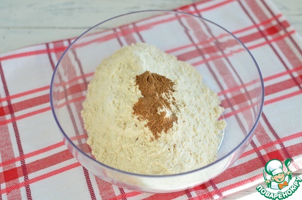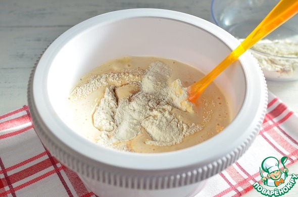 Добавить частями муку со специями и перемешать, чтобы не было комков.