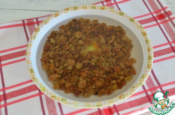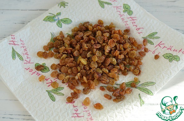 После разбухания изюма воду слить, а изюм просушить бумажным полотенцем.
