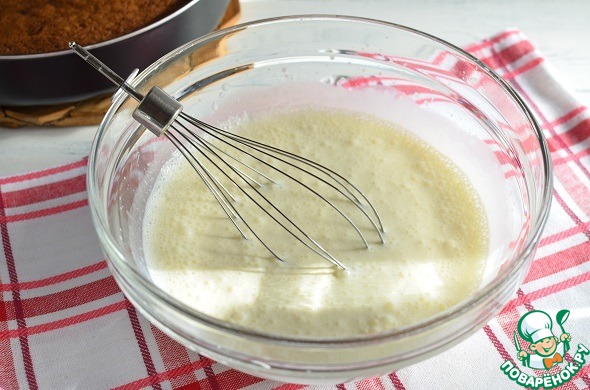 Через 5 мин. после взбивания, добавьте половину цедры (половину оставьте для украшения верха пирога) и влейте, не переставая взбивать, тонкой струйкой сок лимона. До этого крем был жидким, но после введения сока, станет на глазах густым.