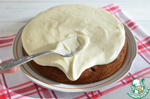Выложите крем сверху остывшего пирога и разровняйте. Помогите ложкой красиво ему стечь по бокам. Украсьте оставшейся цедрой лимона, а в центр я поставила апельсиновые цукаты.