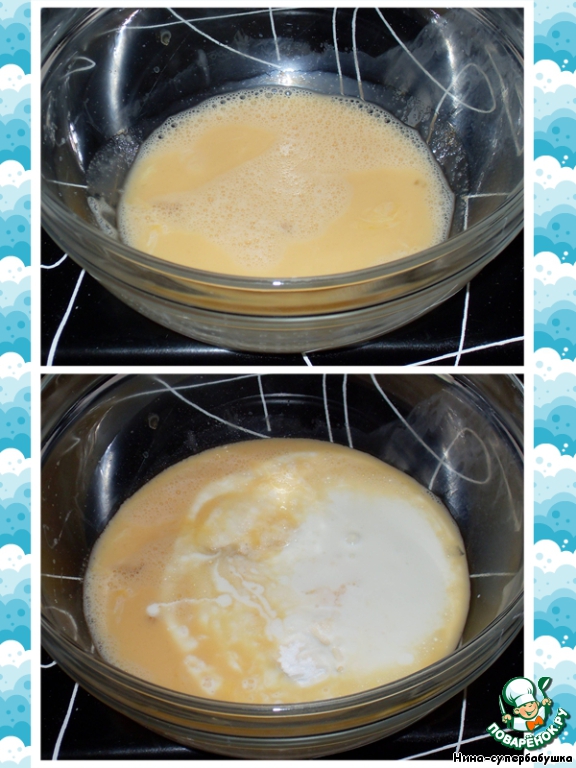 Займемся тестом. Яйца взбить. Добавить кефир, соль и соду и перемешать.