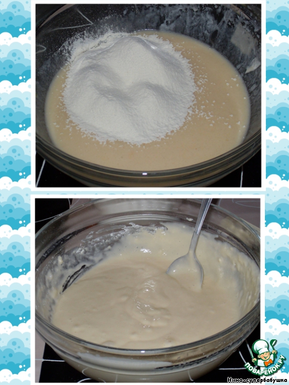 Всыпать муку, перемешивая, пока тесто не станет густотой как на оладьи.