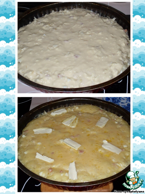 Поставить пирог в горячую духовку на 15-20 минут. Затем вынуть и раскидать несколько хлопьев масла.