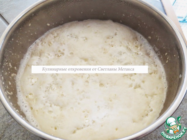 Дрожжи развести в теплом молоке, добавить к ним 1 ст. л. сахара, просеять 2 ст. л. муки, хорошо перемешать, накрыть и оставить в теплом месте на 15 минут.