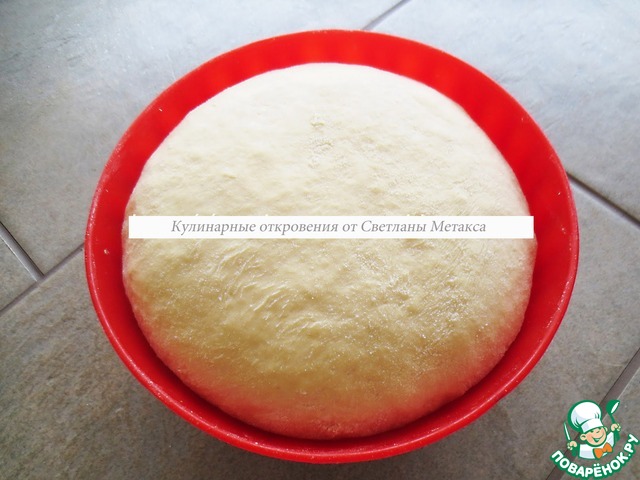 Накрываем тесто пленкой и оставляем в теплом месте на полтора часа. В промежутке замешиваем тесто еще один раз. (тесто в 2 раза должно увеличиться в объеме)