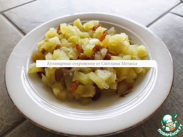 В приготовленный сироп выкладываем яблоки и варим в течении 10 минут, постоянно перемешивая. Убираем с огня, добавляем изюм, хорошо перемешиваем. Начинка готова!