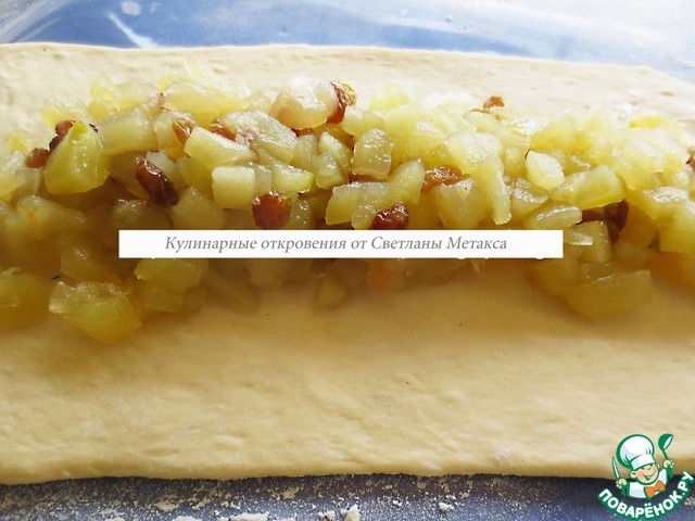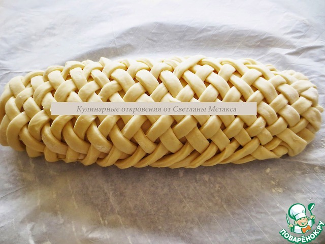 * Для любителей начинки, можно не делать рулет, а выложить начинку на лист, из которого будите плести пирог, но при этом начинка не должна "расплываться" иначе потеряется форма пирога.