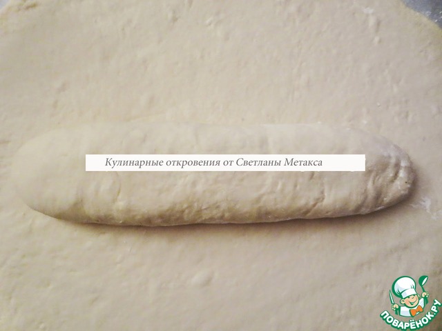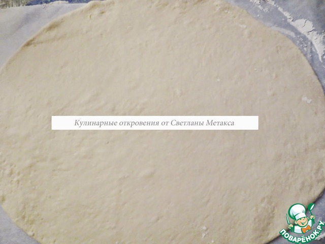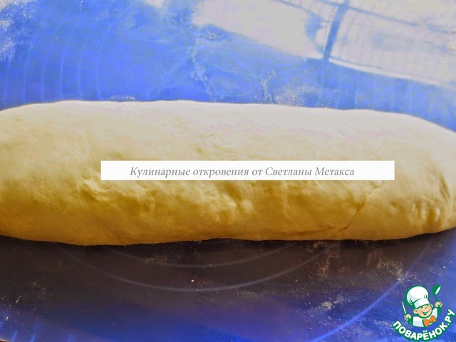 Стол присыпаем мукой и раскатываем большой пласт овальной формы, толщина которого 3-4 мм