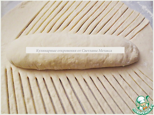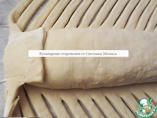 У основания, с той стороны откуда начнем плести пирог, отрезаем ненужную часть теста, оставляя лишь "язычок", который заворачиваем наверх рулета ( см. фото)