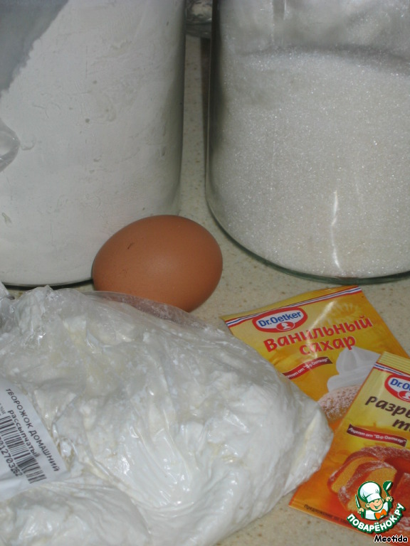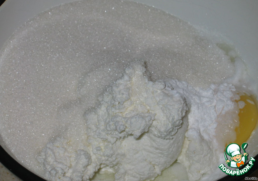 Яйцо, ванильный и обычный сахар, творог смешиваем до однородности (творог лучше брать не зернистый, иначе в тесте будут попадаться крупинки).