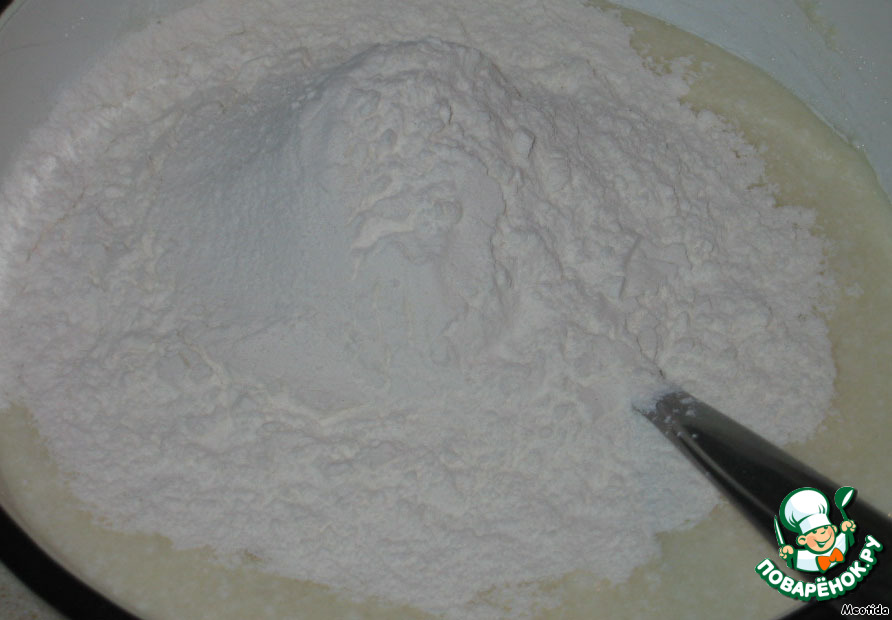 Добавляем в творожную смесь разрыхлитель и 1 стакан муки.