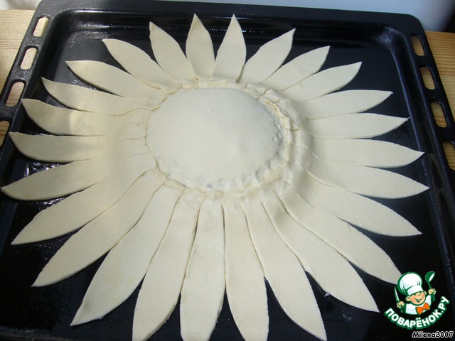 Центр подсолнуха и лепестки смазать желтком. Пирог выпекать при 200 градусах 20-25 мин.