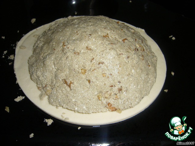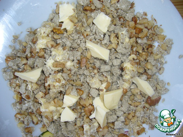 Приготовить начинку. Мелко порубить грецкие орехи, халву, сливочное масло, все перемешать. Скатать в плотный шар.