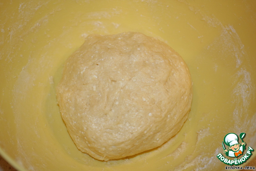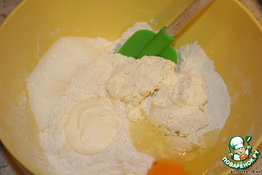 Смешать муку, 125 г размягченного масла, 50 г сахара, 1 ст. л. сметаны, 1 ст. л. разрыхлителя, 1 яйцо, творог, ванильный сахар.