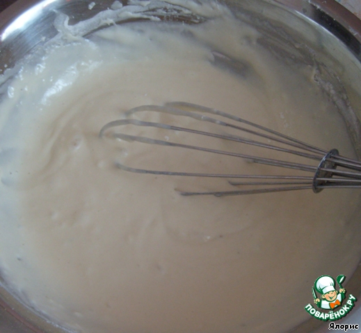 Взбиваем яйца с солью, сметаной или кефиром. Добавляем гашеную соду и 1 стакан муки.