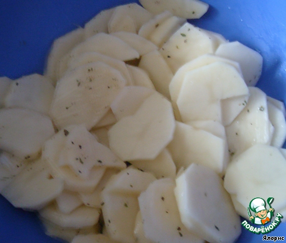 Нарезаем тонкими пластинами картофель, солим его, кладем сушеный базилик, перемешиваем все как следует.