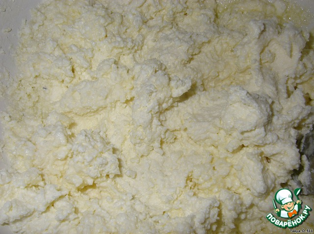 Делаем начинку: в творог добавить растопленное сливочное масло и взбить блендером до однородности. Затем взбить хорошо миксером белки с сахаром, ванильным сахаром и добавить в творог.