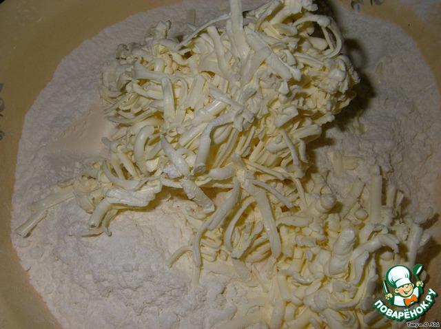 Делаем тесто: в проссеянную муку натереть на терке маргарин.