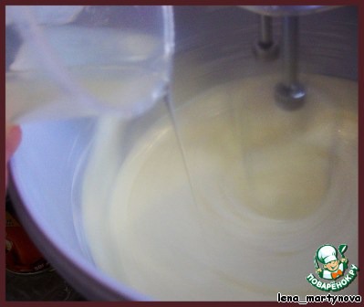 Не прекращая взбивать, тонкой струйкой влить 150мл растительного масла.