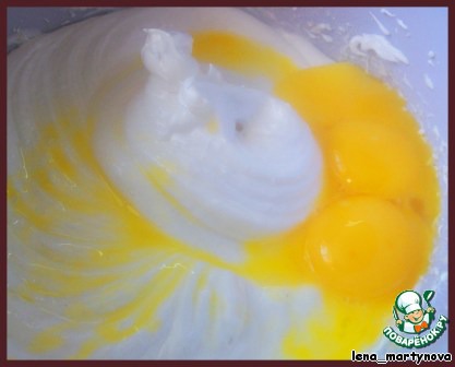 Белки хорошо взбить в пену, в конце взбивания понемногу добавить 150г сахара.