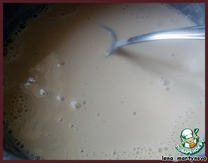 Осторожно влить в эту смесь кипящее молоко с сахаром, размешать и поставить на маленький огонь.