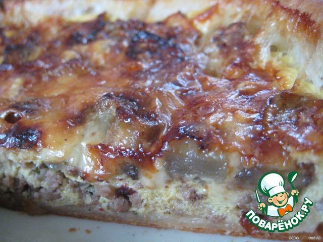 Выкладываем на тесто мясной фарш, баклажаны, кусочки очищенного яблока (по желанию),