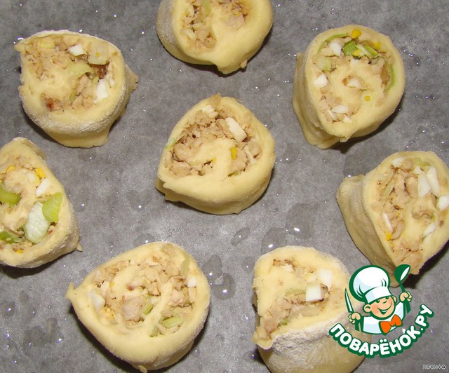 Тесто раскатайте или разомните в лепешку руками... сверху выкладываем начинку и закручиваем в рулет...