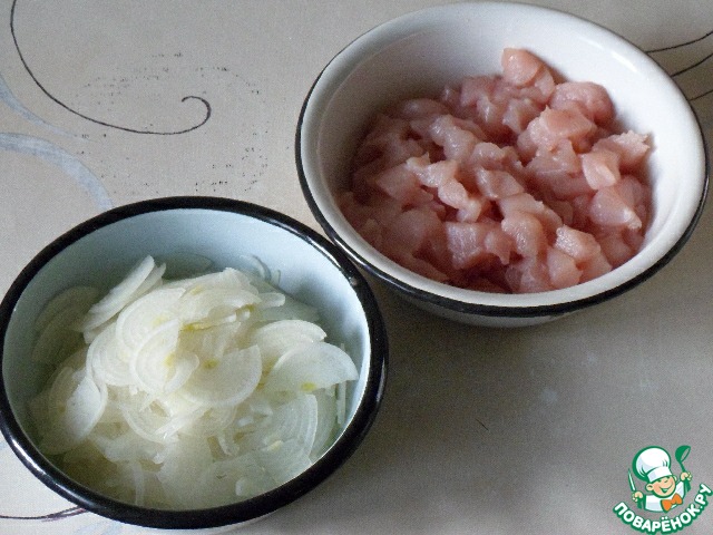 Для начинки № 1 лук нарезать четвертькольцами, мясо - очень маленькими кубиками.