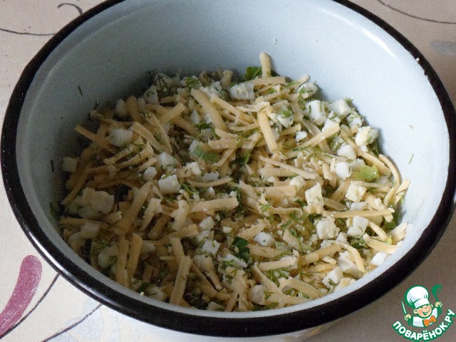 Для начинки № 2 яйца нарезать кубиками, сыр натереть на крупной терке, чеснок измельчить, зелень мелко нарезать. Все ингредиенты смешать.
