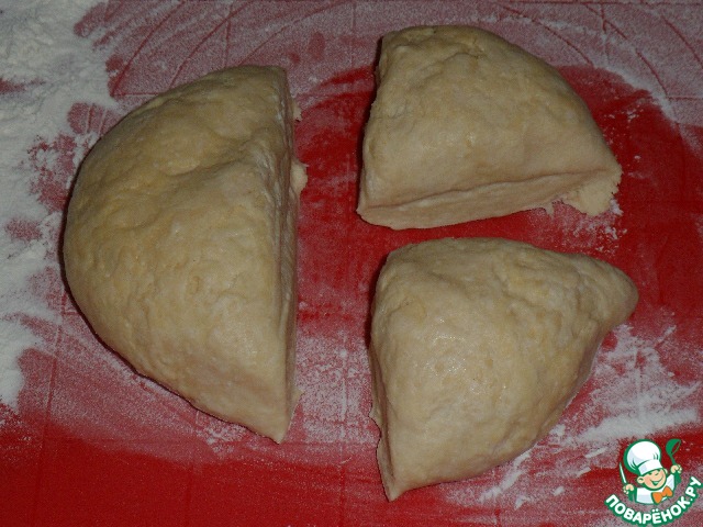Тесто разделить пополам, а затем одну из половинок еще на 2 части.