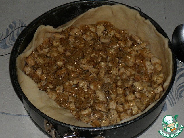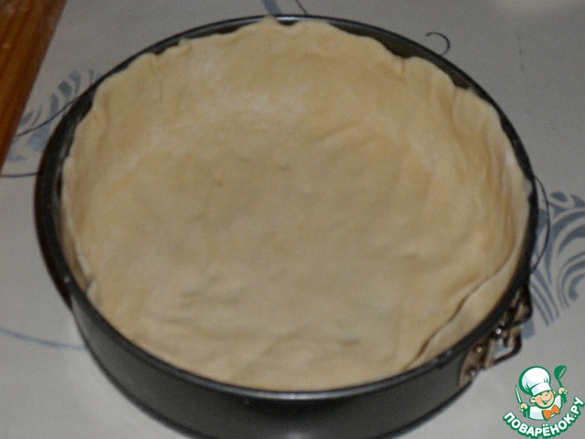 Большую часть теста раскатать в большой круг и выложить в форму так, чтобы края закрывали бортик.