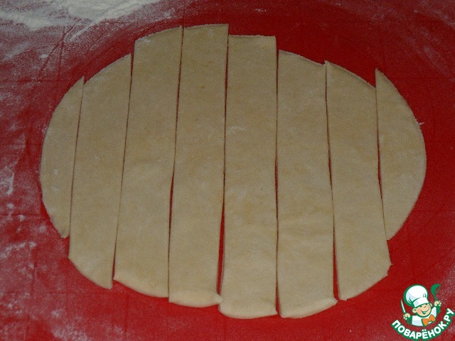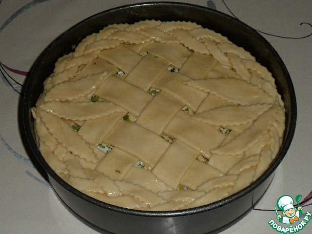 Вторую четвертинку тонко раскатать, нарезать на широкие полоски и выложить на пирог в виде решетки.