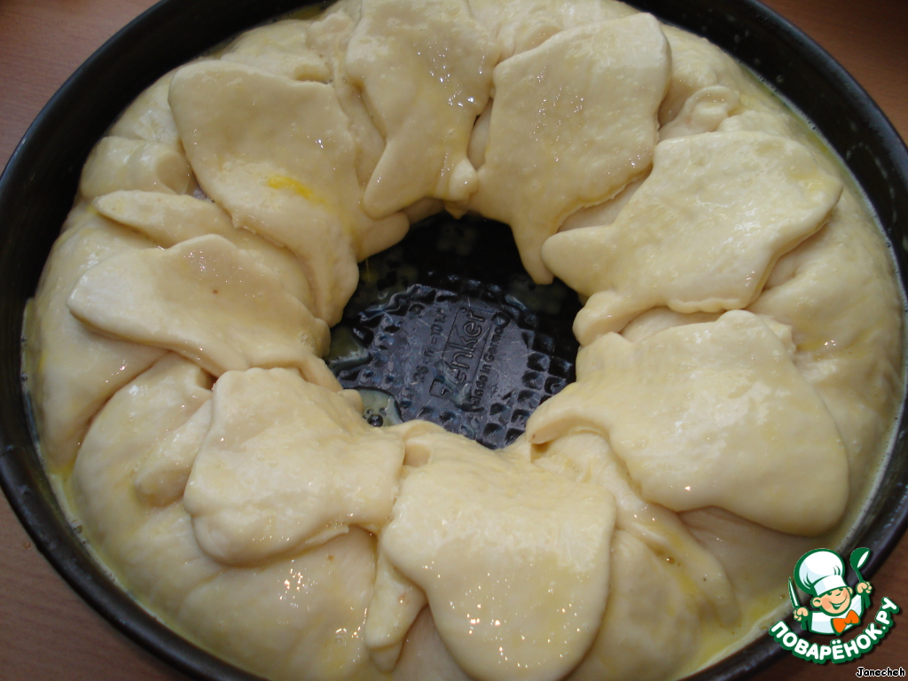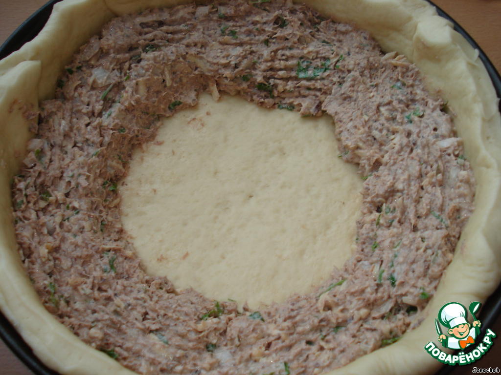 Форму для запекания смажем маслом и присыпим мукой. Раскатаем тесто в круг, больше диаметра формы. Выложим тесто, сформируем бортики, лишнее тесто потом обрежем.