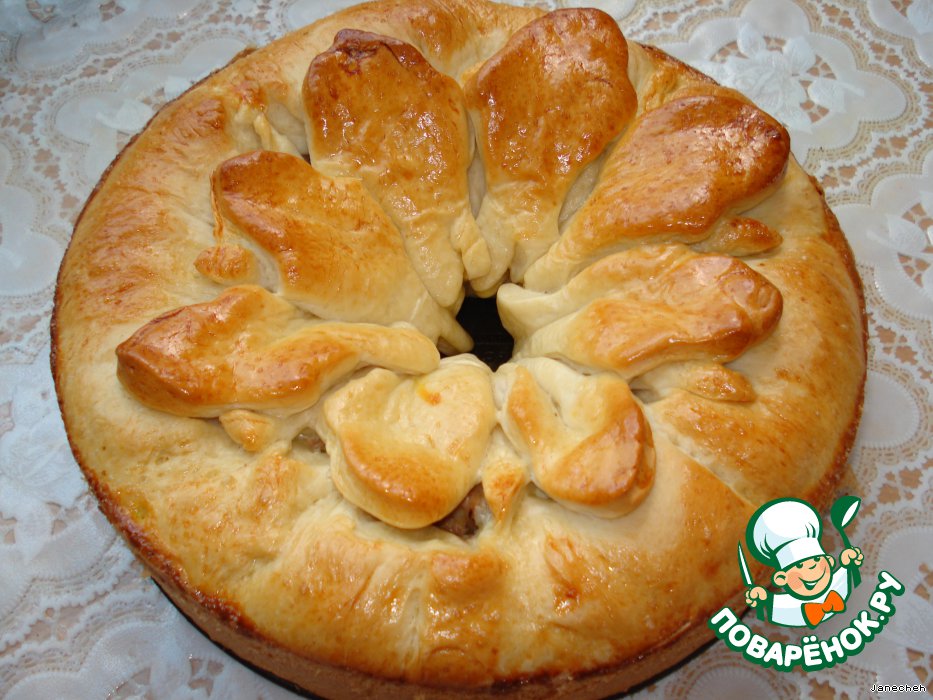 Из оставшегося теста я вырезала рыбок. Смажем желтком и дать подойти 20 минут. Нагреть духовку до 200С. Запекать пирог до готовности.