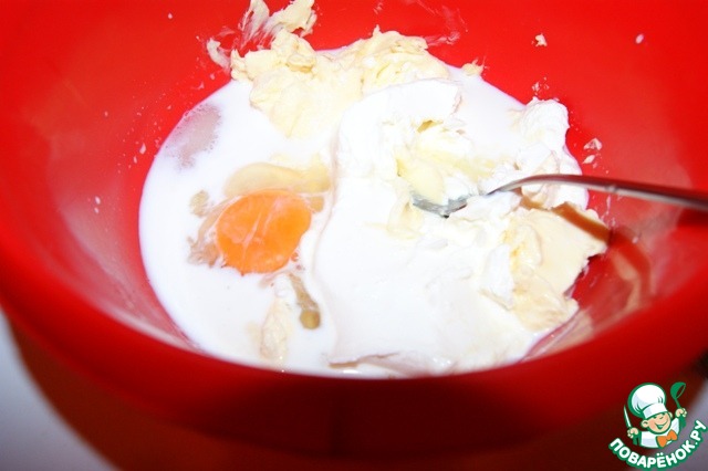 В миске перемешать (не миксером) масло, яйцо 1 шт, сливочный сыр 200 г, сахар и 8 ст. л. молока.