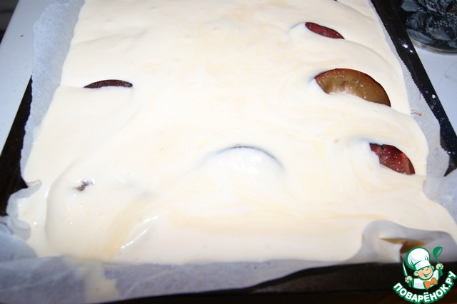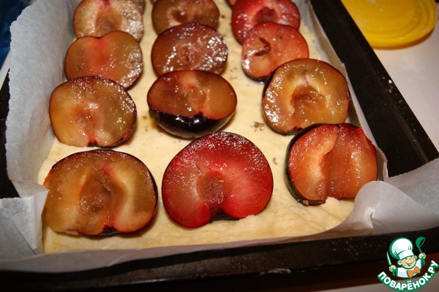 Противень 24Х30 см застелить пекарской бумагой. Обязательно оставьте длинными края бумаги - благодаря им вы легко освободите готовый пирог из формы. Выстелить тесто и сверху поместить сливы срезом вверх и чуть под наклоном.
