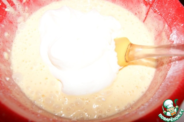 Отдельно взбить сливки до мягких пиков и соединить с остальной массой. Перемешать лопаткой.