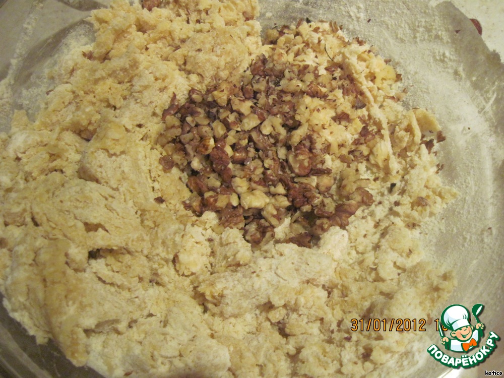 Добавляем муку и слегка измельченные орехи, замешиваем тесто
