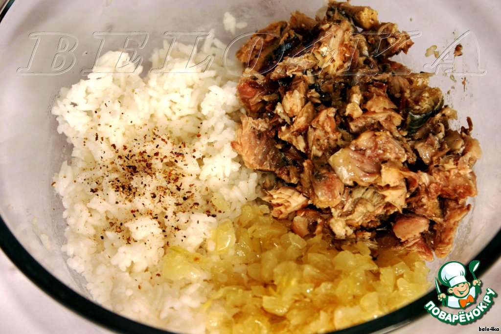 Для начинки отварить и остудить рис. С рыбных консервов слить жидкость, рыбу размять вилкой. Лук потушить на сковороде до мягкости.