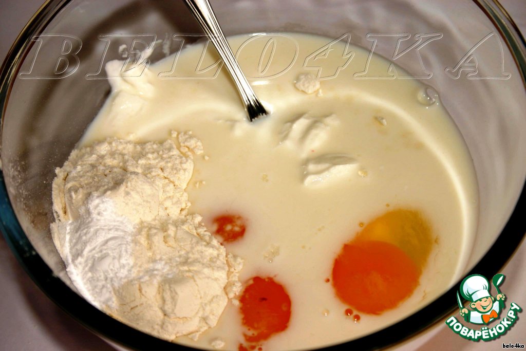 Для заливки смешать молоко, яйца, муку, сметану, присолить.