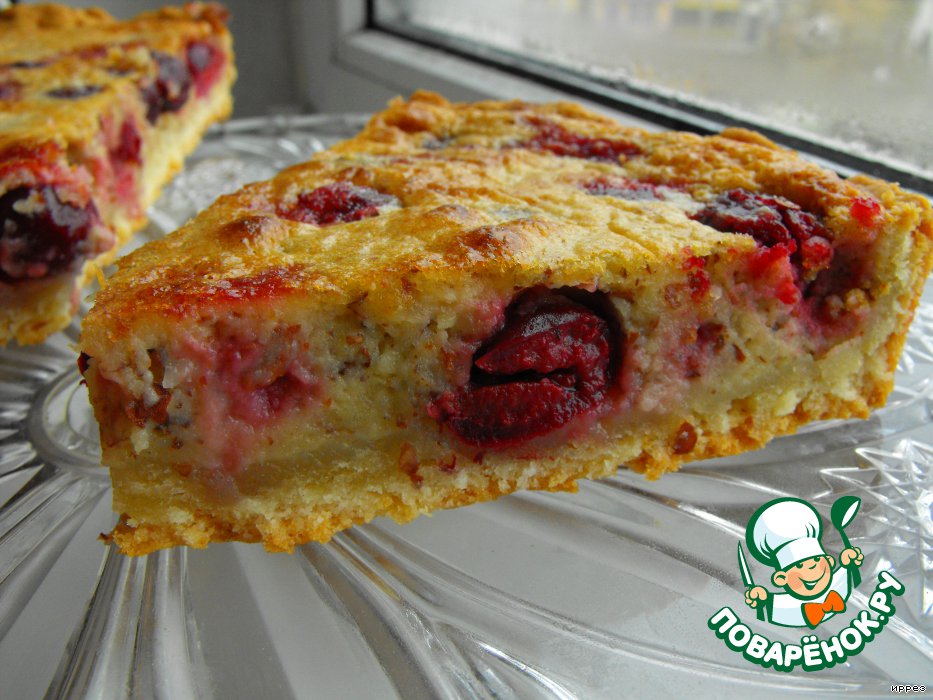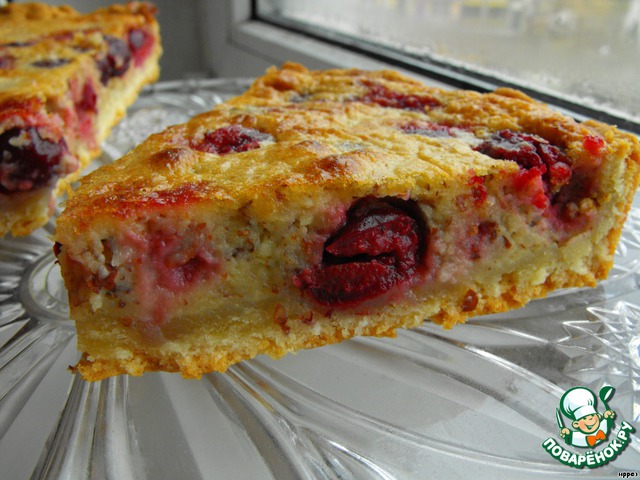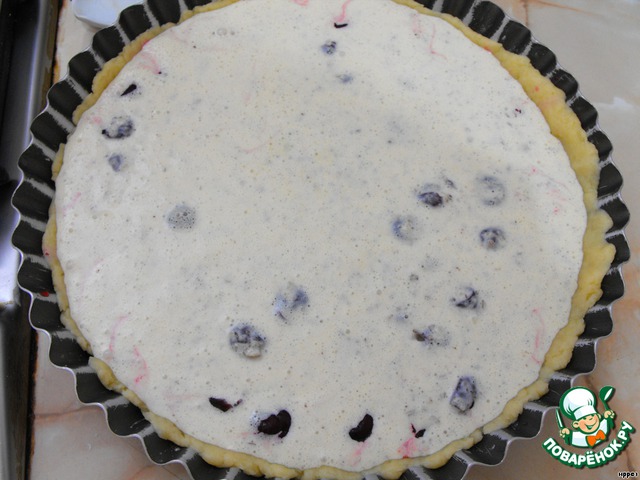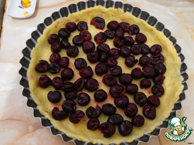 Равномерно распределяем тесто в форме, делая бортики (~3 см). На тесто укладываем вишню (в оригинале - сливы)