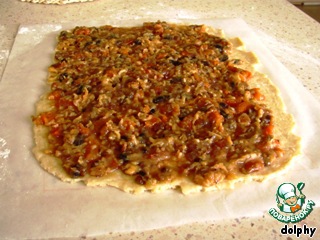Тесто раскатайте в прямоугольник размером 25*35 см. Я делаю это на листе пергаментной бумаги. Равномерно распредедите по нему начинку, оставив пару сантиметров свободными с одного более длинного края.