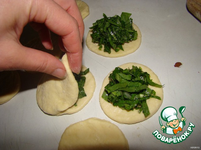 Тесто раскатаем толщиной примерно 5 мм .С помощью стакана вырезаем круги.Каждый второй круг по ободку смочим водой(Кисточкой или пальцем)В середину кладем начинку из щавеля .Накрываем вторым кружочком защипываем края (Вы можете слепить форму обычных пирожков.Форма зависит от вашего желания.Тут я советов не даю.Показываю ,как делаю я)))