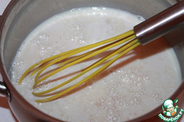 Молоко подогреваем до горячего состояния, но не до кипятка. В молоко добавляем сахар, соль и дрожжи. Перемешиваем либо руками, либо удобно это делать венчиком. Оставляем на 15 - 20 минут для разжижения в теплом месте.