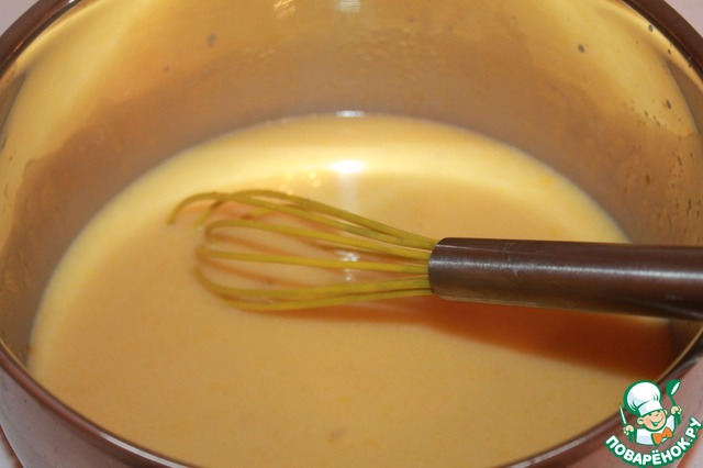 Добавляем к разжиженной закваске предварительно взбитые до однородности два яйца, сливочное масло и все тщательно перемешиваем.